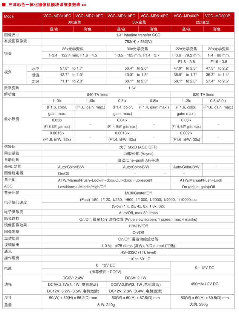 主要技术性能: 1/4" Exview HAD CCD,约47万像素 大于520电视线的解析度 使用全固态元件,出色的抗震效果 单彩型:0.8Lux(F1.4 50IRE) 昼夜型:彩色0.8Lux/黑白0.04Lux(F1.4 50IRE) 30倍光学变焦,16倍电子变焦 总480倍变焦效果 f=3.5-105mm;F=1.4-3.7 VCC-MD500PC(彩色)