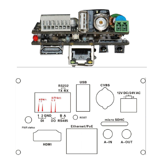 支持接口:音频输入/输出、报警输入/输出、HDMI视频输出、存储卡接口、USB接口、复位、RS485、自动光圈接口。